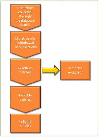 The survey was conducted in May 2017 and collected a total of 125 articles. After removing duplicate articles, 62 articles remained, and two authors chose four relevant articles (Figure 1), accounting for a total of four summarized articles. After reading the full text of the article, the authors were in full agreement on the selection, considering the inclusion and exclusion criteria.
